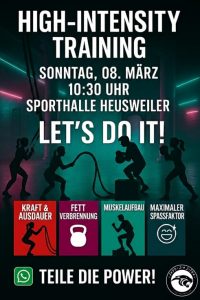- Event:🔥 HIGH-INTENSITY TRAINING – BIST DU BEREIT? 🔥Du willst mehr als nur ein normales Training?Du willst schwitzen, kämpfen und über dich hinauswachsen? Dann ist dieses Event genau für dich! 💪 Unser Fitnesskurs bringt regelmäßig Special-Workouts und neue Events, damit du dein Training auf das nächste Level bringen kannst. Hier geht es nicht… Event:🔥 HIGH-INTENSITY TRAINING – BIST DU BEREIT? 🔥 weiterlesen